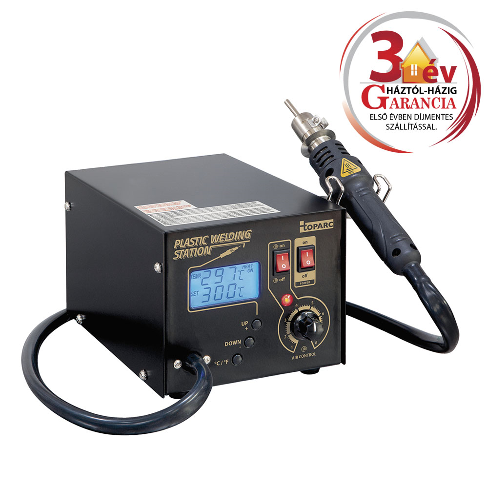A könnyen használható forrólevegős műanyag hegesztőállomás (2 db fúvókával Ø 5 mm + Ø 8 mm) a járművek műanyag alkatrészeinek hegesztésére szolgál. Az állítható, széles hőmérséklet-tartomány (160-480°C) a műanyagok hőmérsékletét olvadáspontjukig emeli, így azok puhává és könnyen javíthatóvá válnak. A levegő áramlási sebessége állítható, a műanyag homogén összeolvadásának fenntartása érdekében.