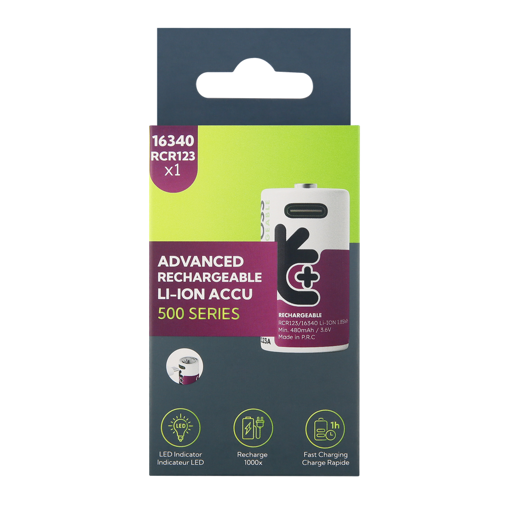 Uniross USB-C 3.7V Li-ion akkumulátor, RCR123, 34.5 mm, 500 mAh, 1 db/bliszter